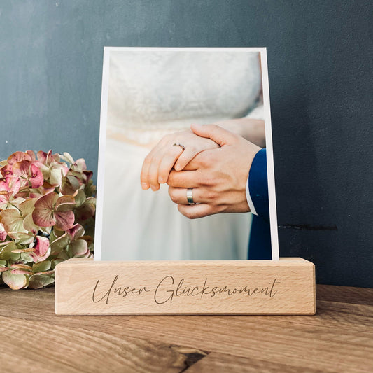 Personalisierter Foto- und Kartenhalter aus Holz - 15 cm
