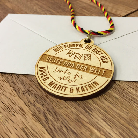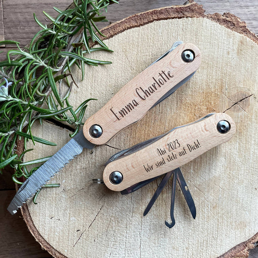 Graviertes Taschenmesser mit hellem Holzgriff und 11 Funktionen