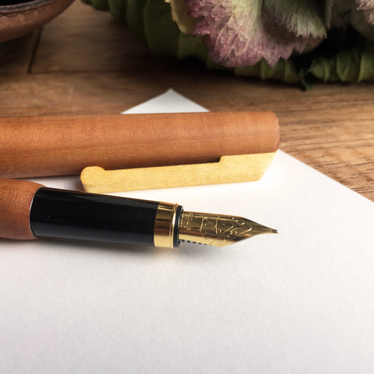 Füllfederhalter und Etui aus Birnenholz, mit Gravur