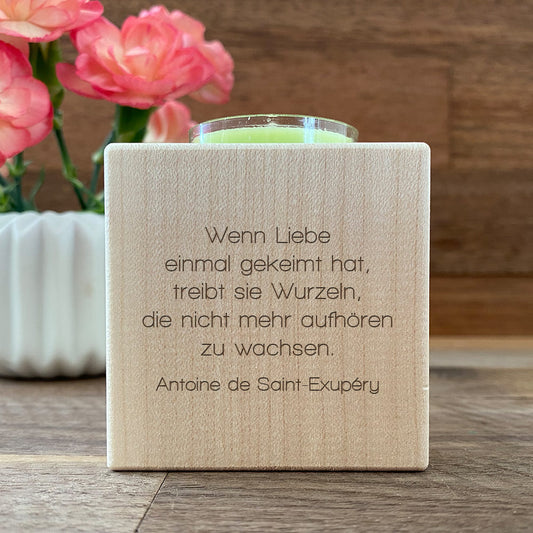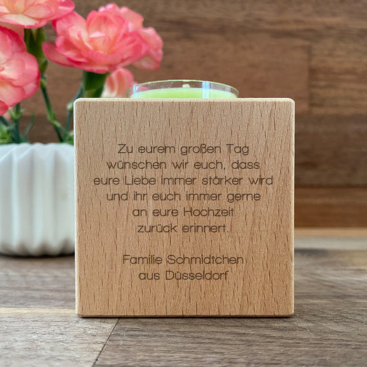 Die personalisierten Teelichthalter sind eine romantische Ergänzung für das Hochzeitsgeschenk. Diese stilvollen Holzhalter können mit dem Familiennamen des Paares, romantischen Symbolen oder dem Hochzeitsdatum graviert werden. Sie schaffen eine warme und romantische Atmosphäre und dienen als Erinnerung an den besonderen Tag der Hochzeit.