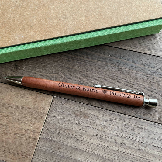 Die meisten unserer Holzkugelschreiber kannst Du mit einer individuellen Gravur personalisieren lassen. Ob Name, Initialen oder ein kurzer Schriftzug – eine Gravur macht Deinen Kugelschreiber zu einem ganz persönlichen Begleiter oder zu einem einzigartigen Geschenk. Je nach Holzart erscheint der gravierte Text klar und kontrastreich oder dezent und edel zurückhaltend.