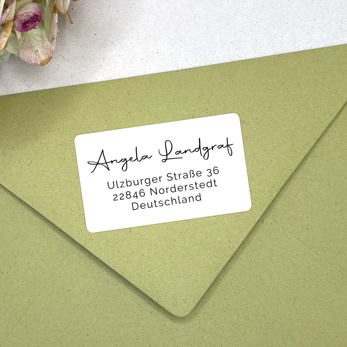 Individuell gestaltet: Jeder Aufkleber wird mit Deinem Namen in eleganter Schreibschrift und Deiner Adresse in klarer Druckschrift personalisiert.