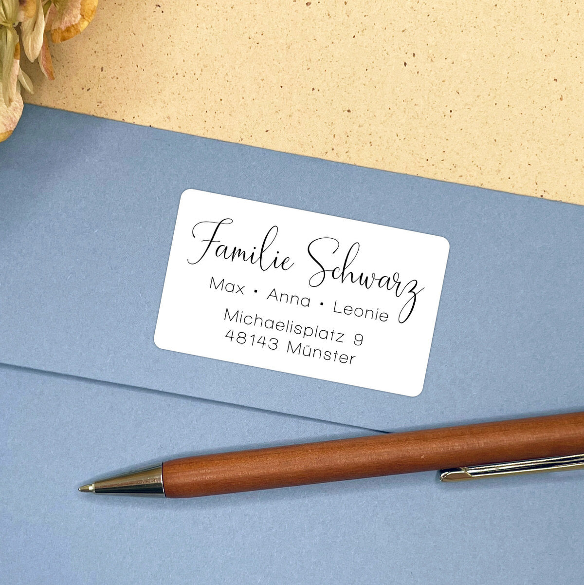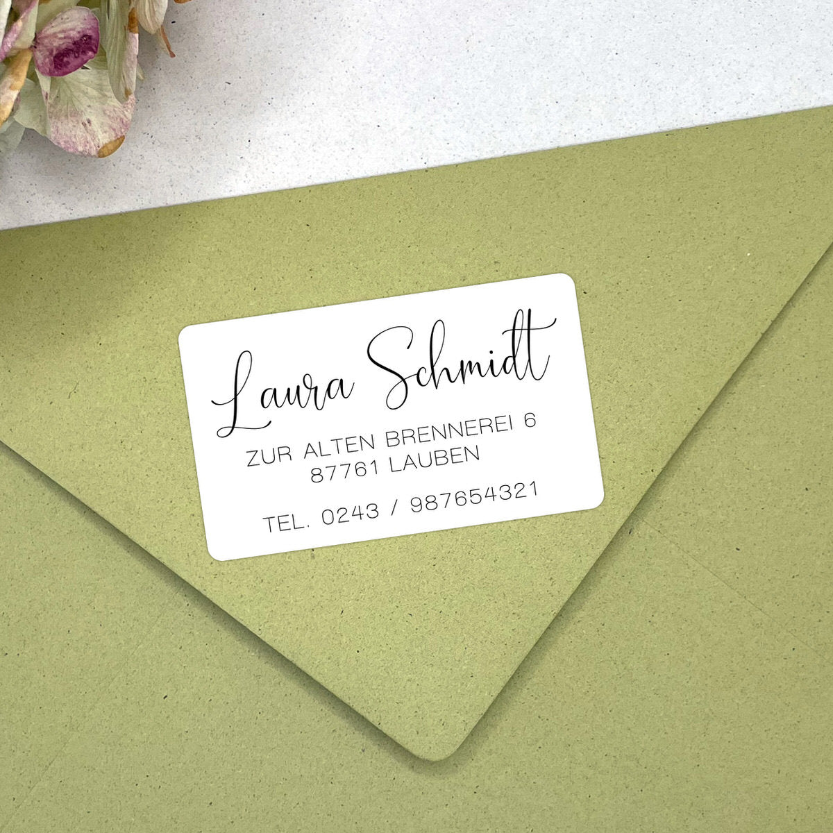Individuell gestaltet: Jeder Aufkleber wird mit Deinem Namen in eleganter Schreibschrift und Deiner Adresse in klarer Druckschrift personalisiert.