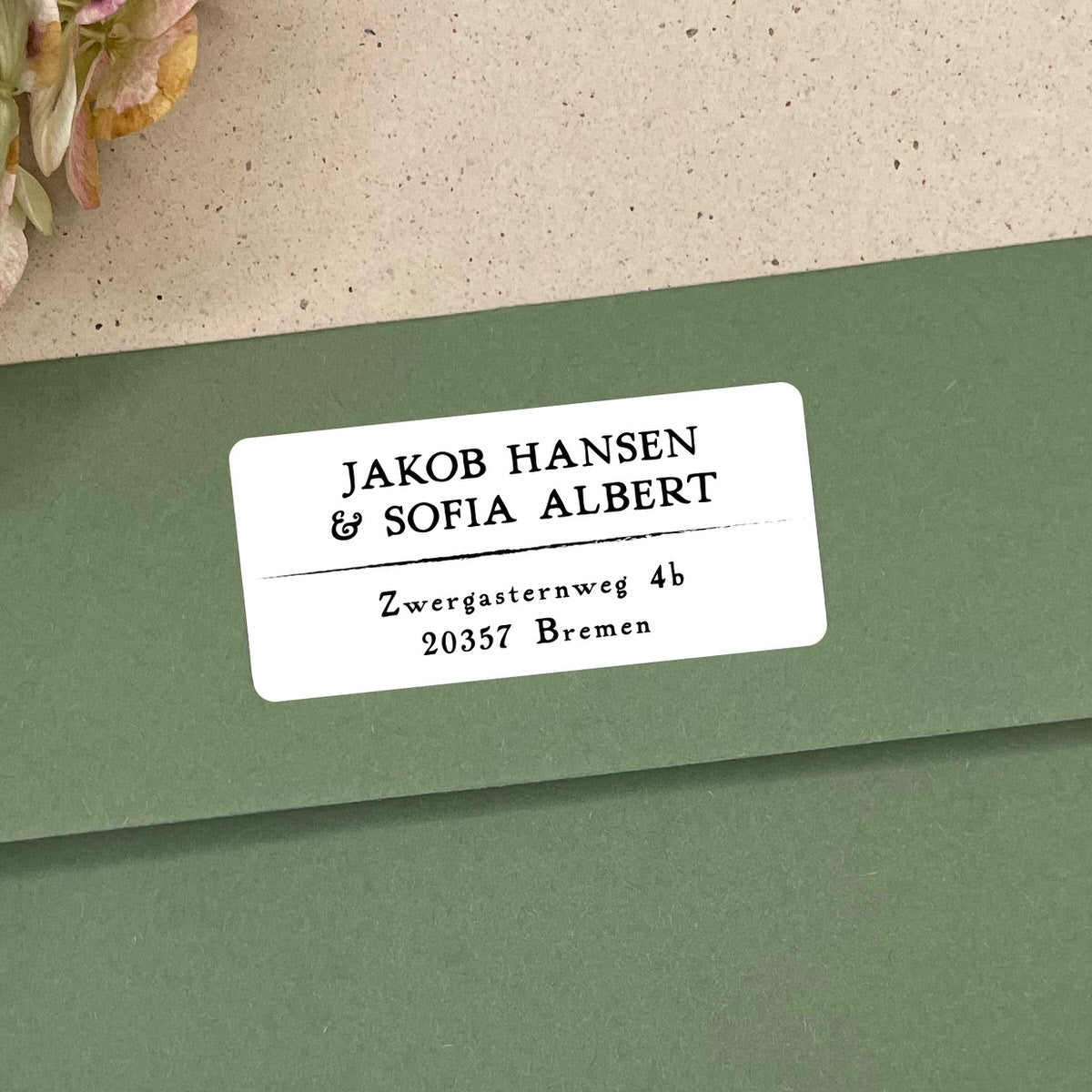 Individuell gestaltet: Jeder Aufkleber wird mit Deinem Namen in eleganter Schreibschrift und Deiner Adresse in klarer Druckschrift personalisiert.