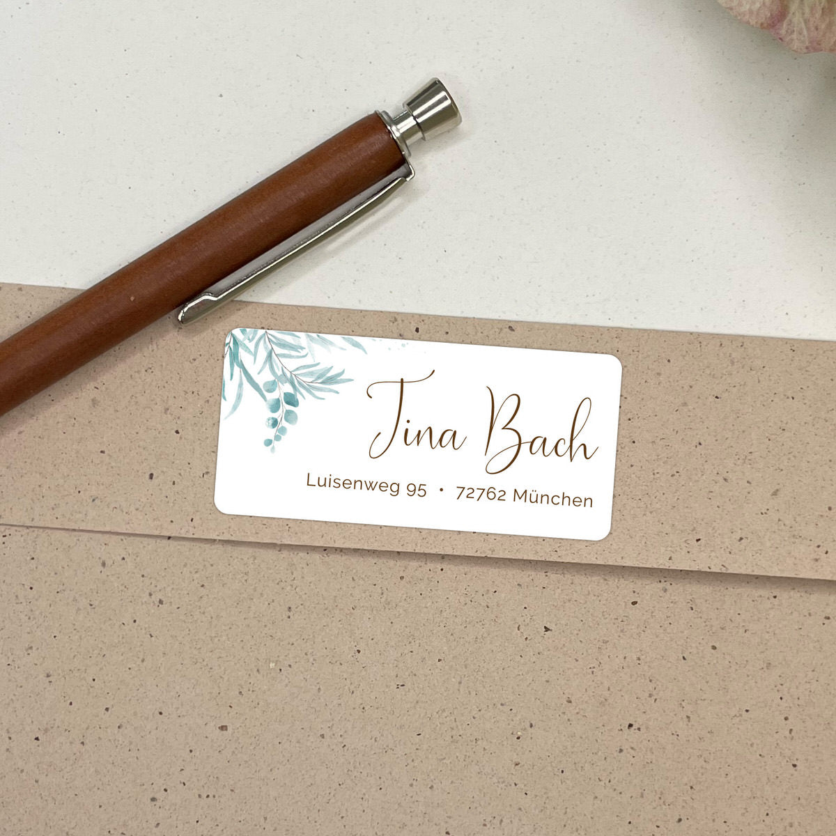 Individuell gestaltet: Jeder Aufkleber wird mit Deinem Namen in eleganter Schreibschrift und Deiner Adresse in klarer Druckschrift personalisiert.