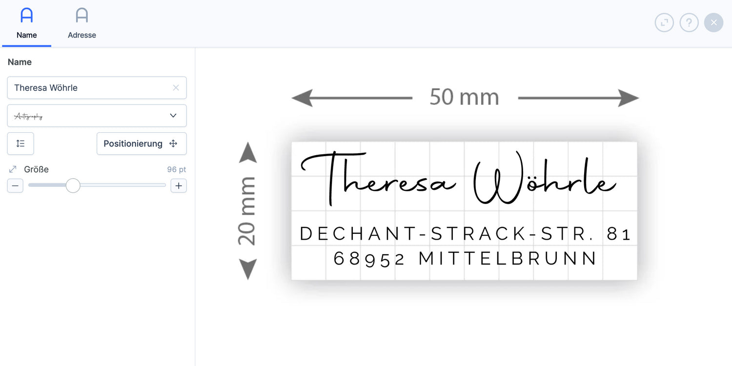 Die Abmessungen Deines persönlichen Adressstempels richten sich nach der gewählten Stempelgröße. Bei besonders langen oder kurzen Namen und Adressen passen wir die Abmessungen ggfls. geringfügig an.