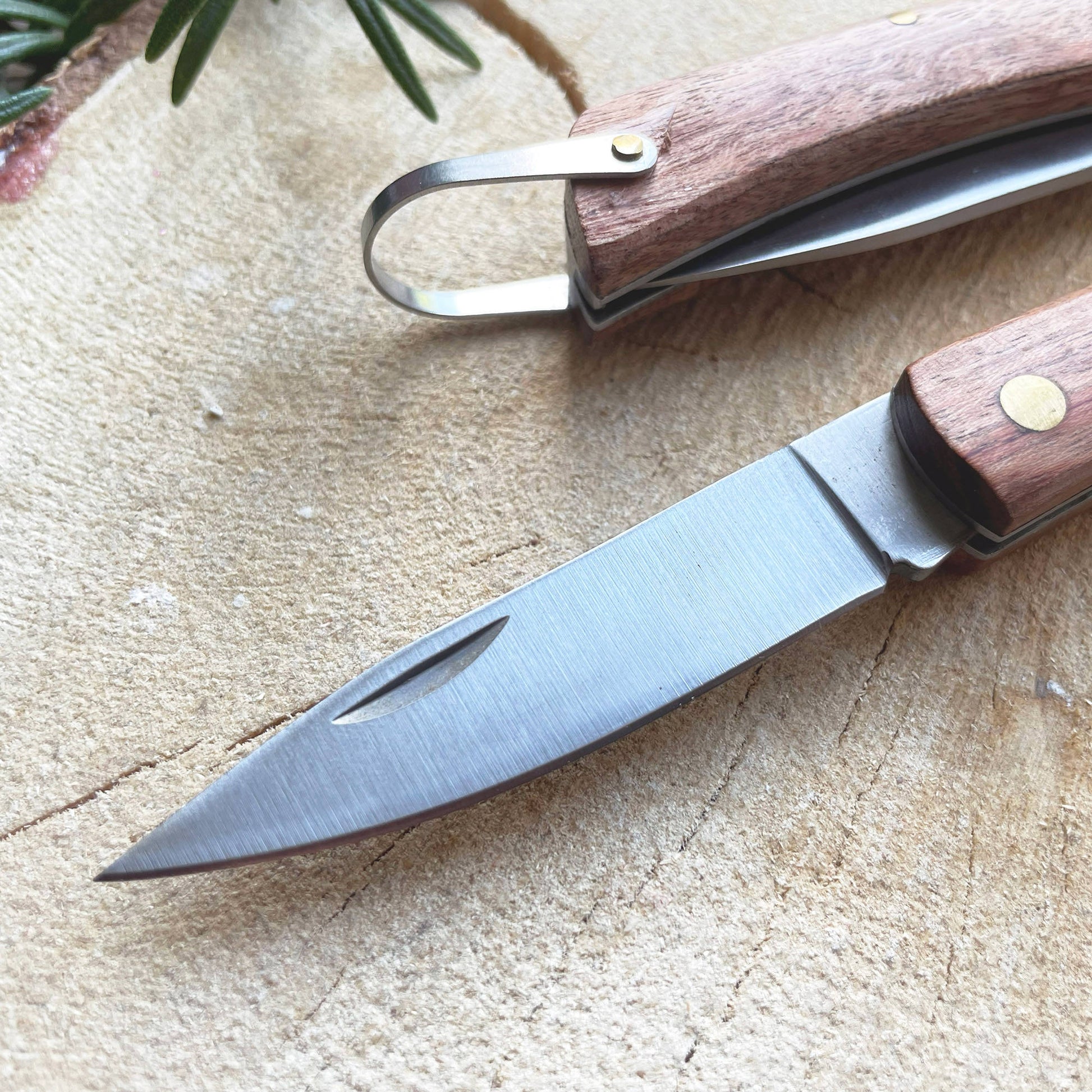 Edles Taschenmesser mit einem Griff aus Holz und einem beweglichen Bügel zum Aufhängen oder Befestigen am Schlüsselbund.