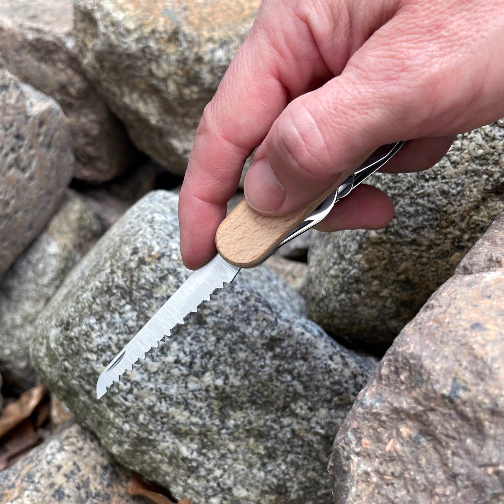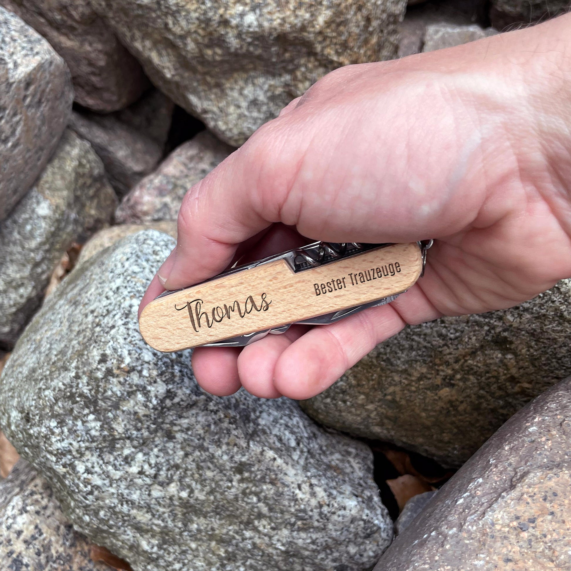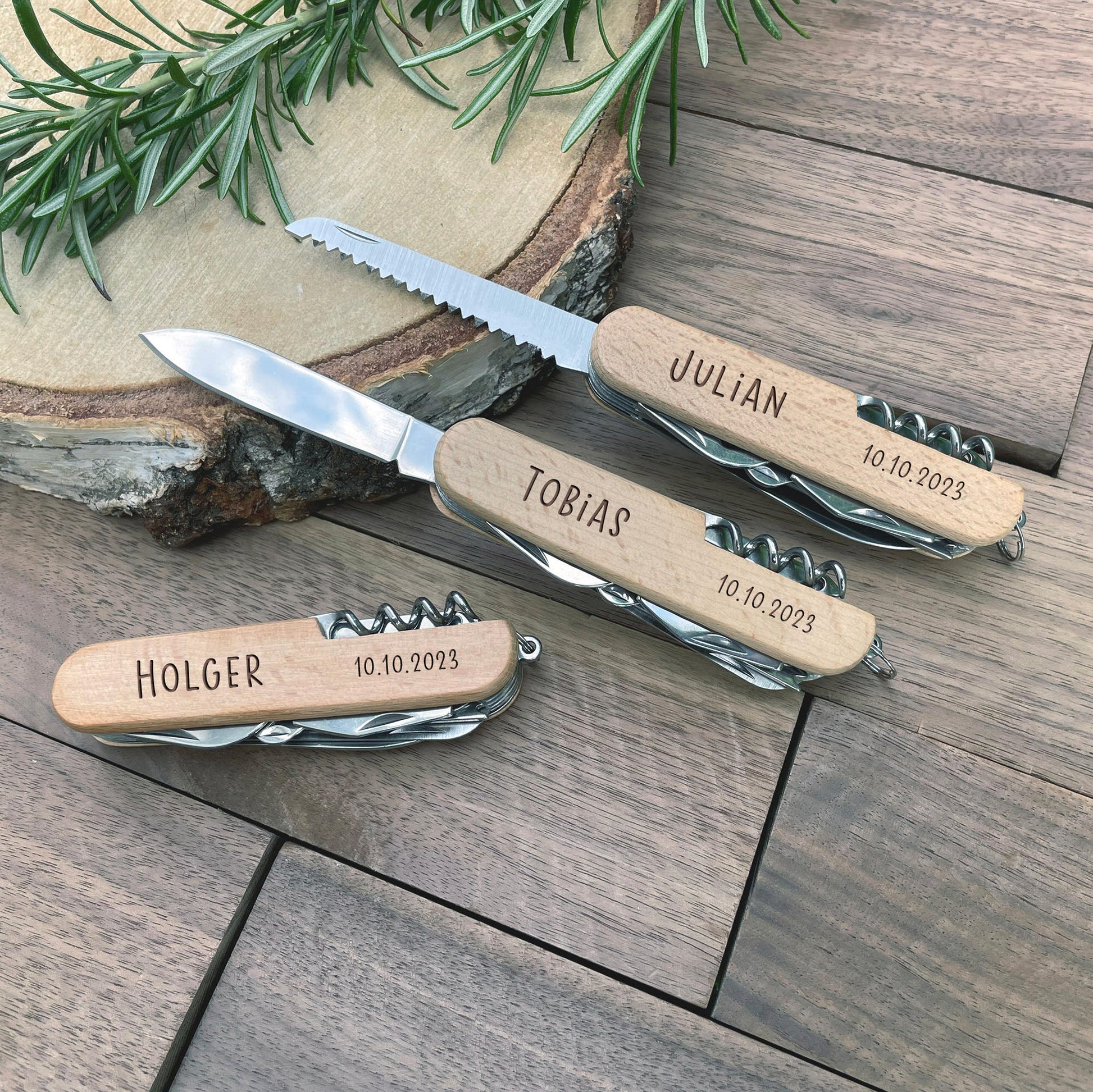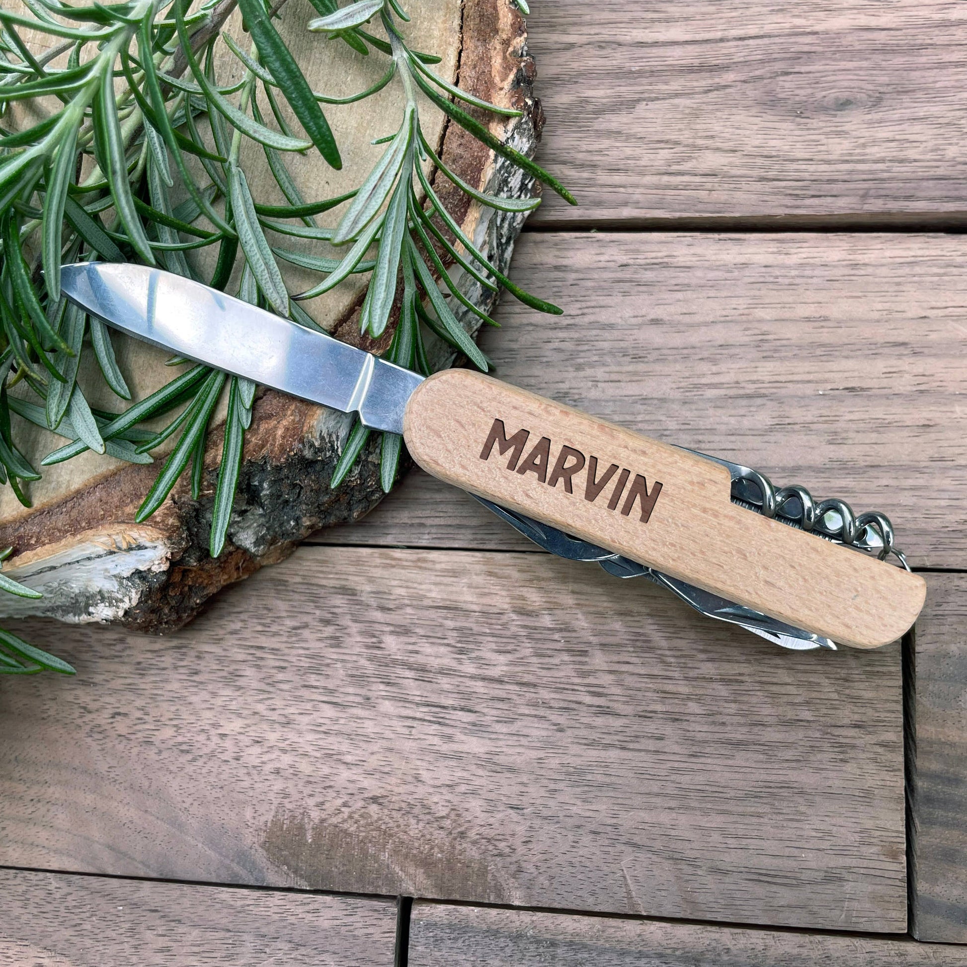 Graviertes Taschenmesser mit hellem Holzgriff und 11 Funktionen