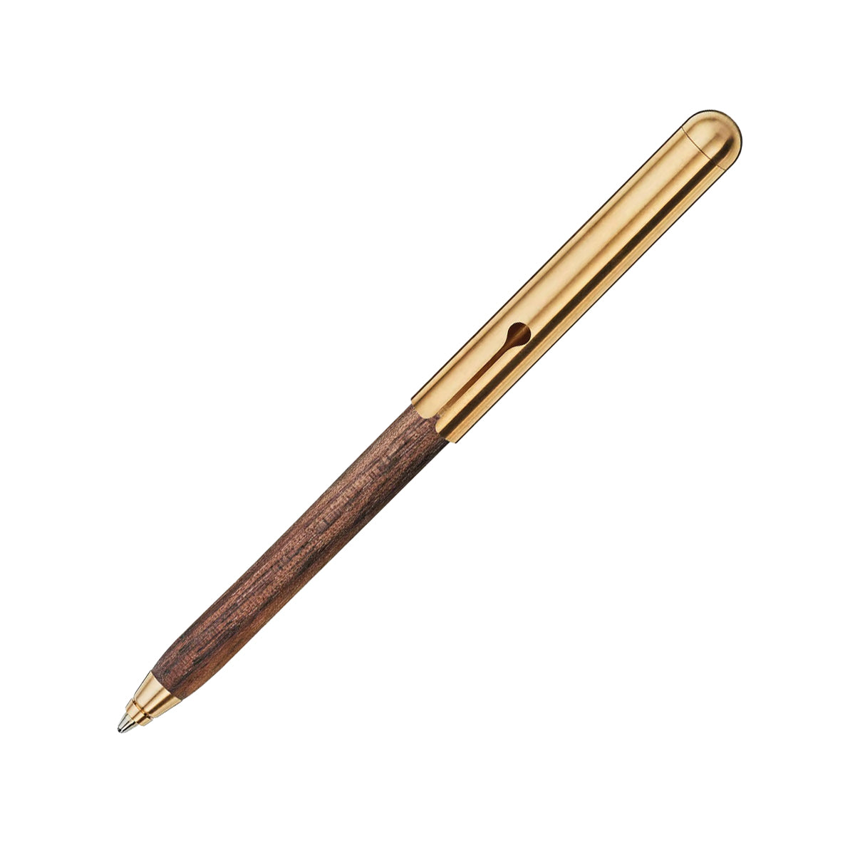 Der Mini-Kugelschreiber STYLE ist ein Designstück im Taschenformat. Massives Walnussholz wird bei ihm mit einer Kappe aus rohem Messing kombiniert.